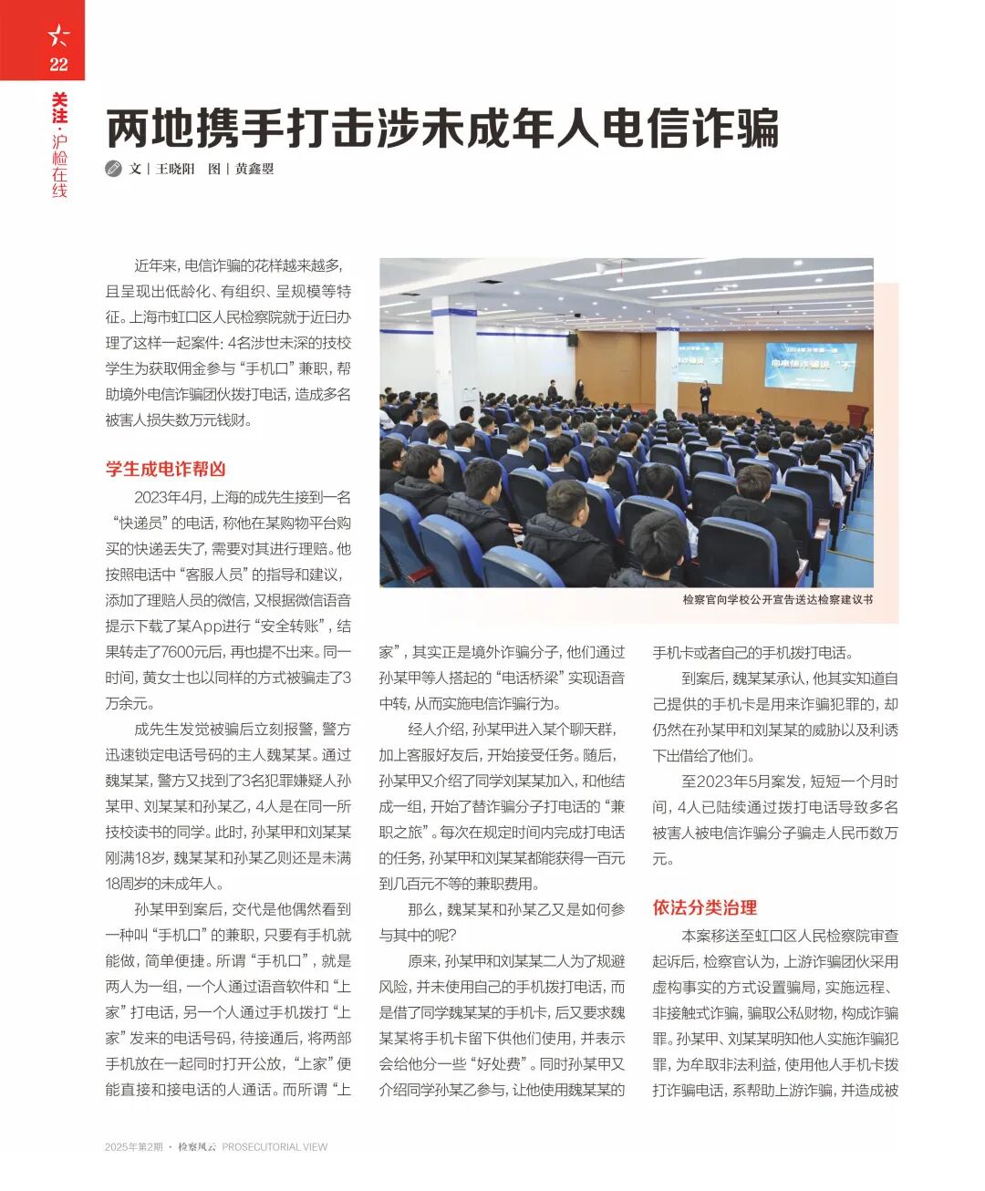检察官介绍,沪辽两地司法机关组建了一支跨省联动专业化队伍,成立了异地协作法律教育实践基地,提升了在校学生自我预防、自我保护、自我应对的反诈意识,助其紧紧系好人生第一粒扣子,力求从源头上有效预防和减少未成年人电信诈骗犯罪。